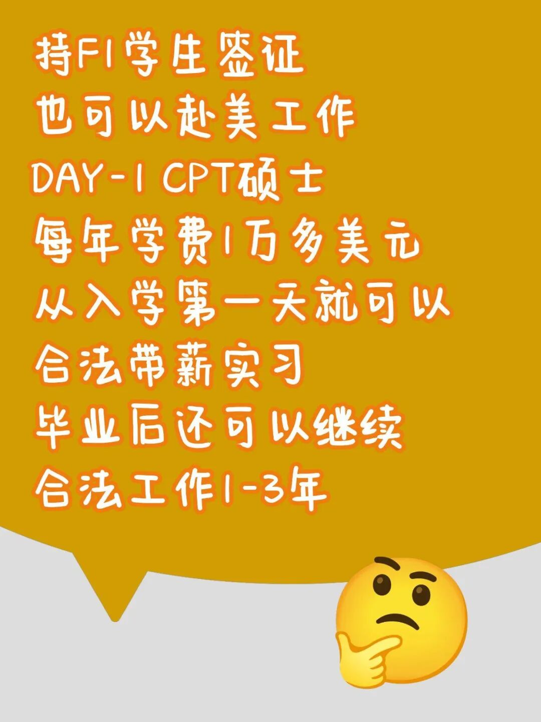 持F1学生签证也可以赴美工作?美国不少大学开设DAY-1 CPT硕士,从入学第一天就可以半工半读,使用Full-time CPT和Part-time CPT在美国合法带薪实习。如果时间安排合理,Full-time CPT使用不超过12个月,STEM领域毕业后还可以继续在美国合法带薪工作3年(OPT),非STEM领域则为1年(OPT)。每年学费1万多美元,很快就可以获得经济回报,积累美国工作经验和行业人脉。
