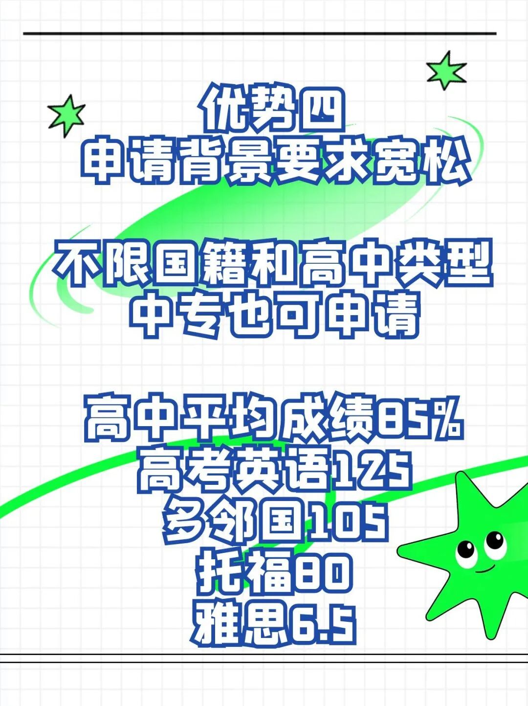 第四,申请背景要求宽松:不限国籍和高中类型,普通高中、国际高中、美高、IB、A-level等国际体系、中专(有高中语数外等基础课程)均可申请。高中平均成绩85分以上(百分制)。英语语言成绩:高考英语125分,或多邻国105分,或托福80分,或雅思6.5分。