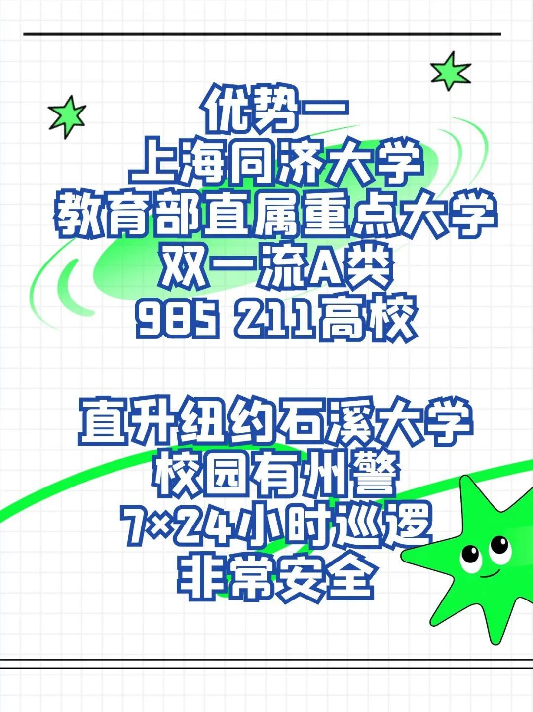 第一,中美大学优秀:上海同济大学,成立于1907年,教育部直属重点大学,是双一流A类,985,211工程建设高校。大一在上海学习,体验中国顶尖大学集体生活,大二直接升读纽约石溪大学,校园有纽约州警7×24小时巡逻,非常安全。