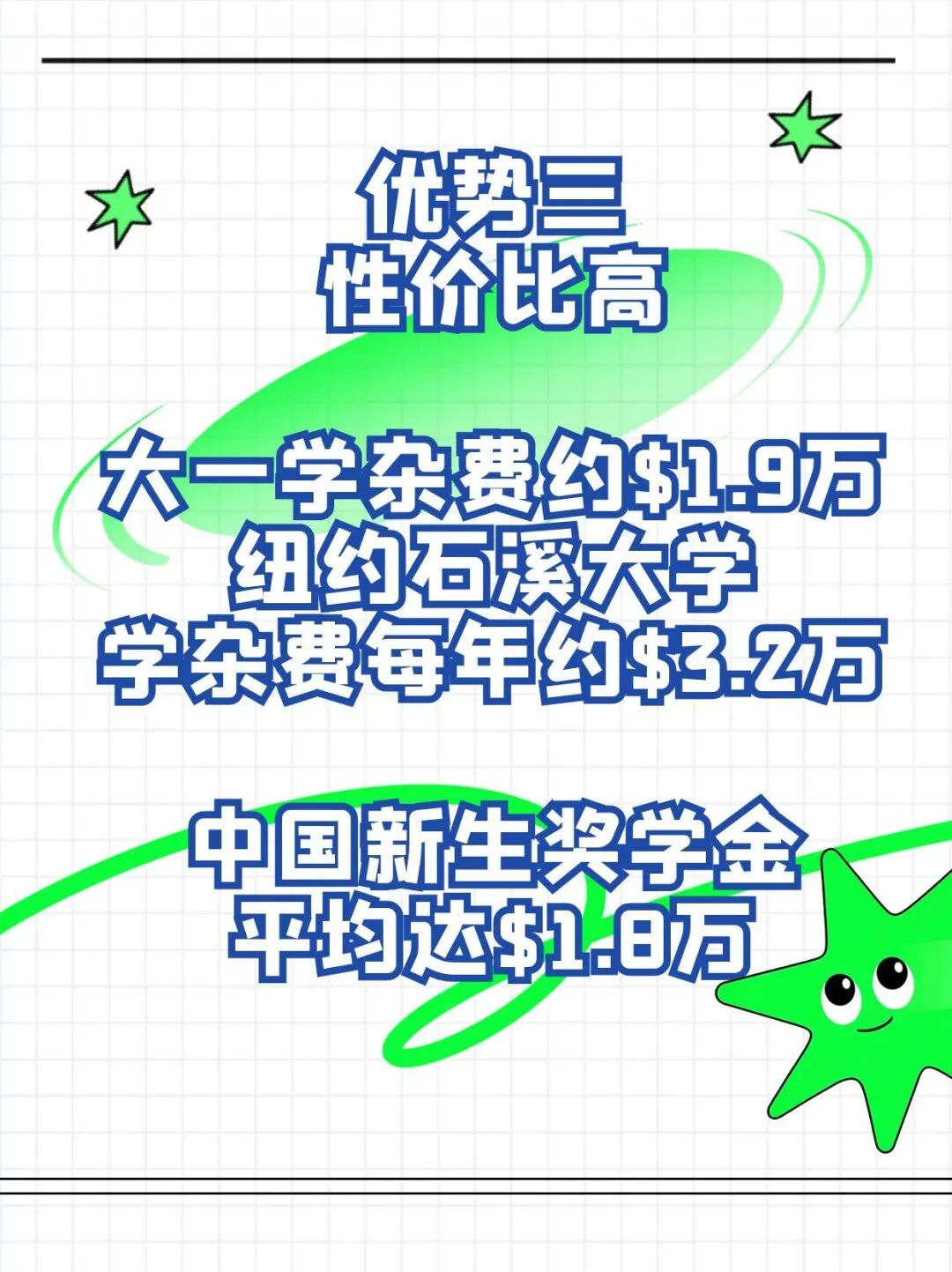 第三,性价比高:大一在国内生活,在同济大学学杂费每年约1.9万美元,在纽约石溪大学本科学杂费每年约3.2万美元,2024秋季中国新生本科奖学金获取率高达85%,平均金额达1.8万美元。