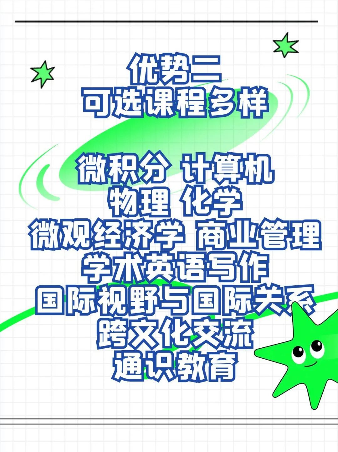 第二,可选课程多样:微积分、计算机原理、基础物理及实验、基础化学、微观经济学、商业管理、学术英语写作、国际视野与国际关系、跨文化交流、通识教育系列课程等。
