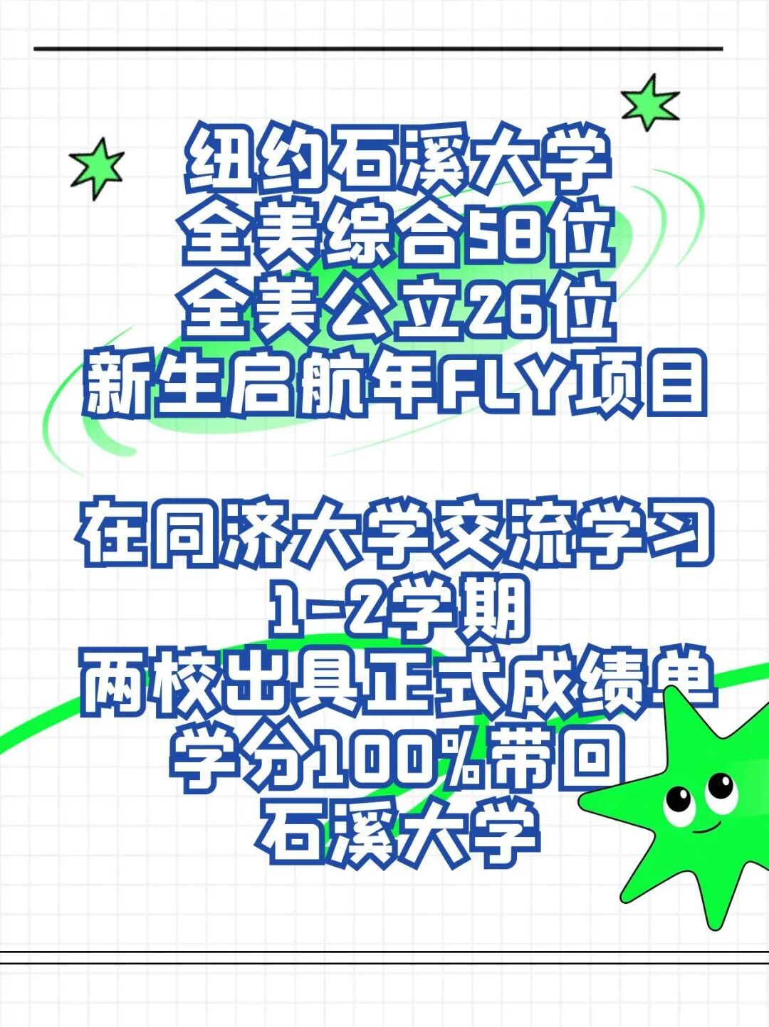 新生启航年FLY项目和其他国际大一或桥梁项目不同,本质为纽约石溪大学本科直录,不存在二次升学或转学要求。新生以交换生的身份在同济大学交流学习1-2学期,每学期修读15学分本科课程,授课语言为英语或中英双语,以石溪大学课程大纲为基础,由同济大学教师负责教学,通识教育课程将与同济全日制学生共同学习。两校均出具正式成绩单,学分100%带回石溪大学。FLY项目优势: