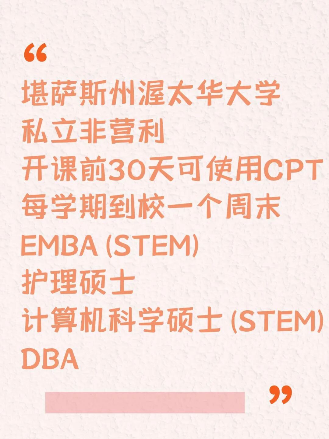渥太华大学(Ottawa University),成立于1865年,校区位于堪萨斯州渥太华和欧弗兰帕克,是一所私立非营利性大学。开设多个DAY 1 CPT硕博研究生课程,无需申请费,在课程开始前30天,就可以使用CPT在美国合法工作,适合前一个学位OPT快结束的同学。每学期一个周末到校参加面授,其余课程线上完成,适合学生异地灵活工作。