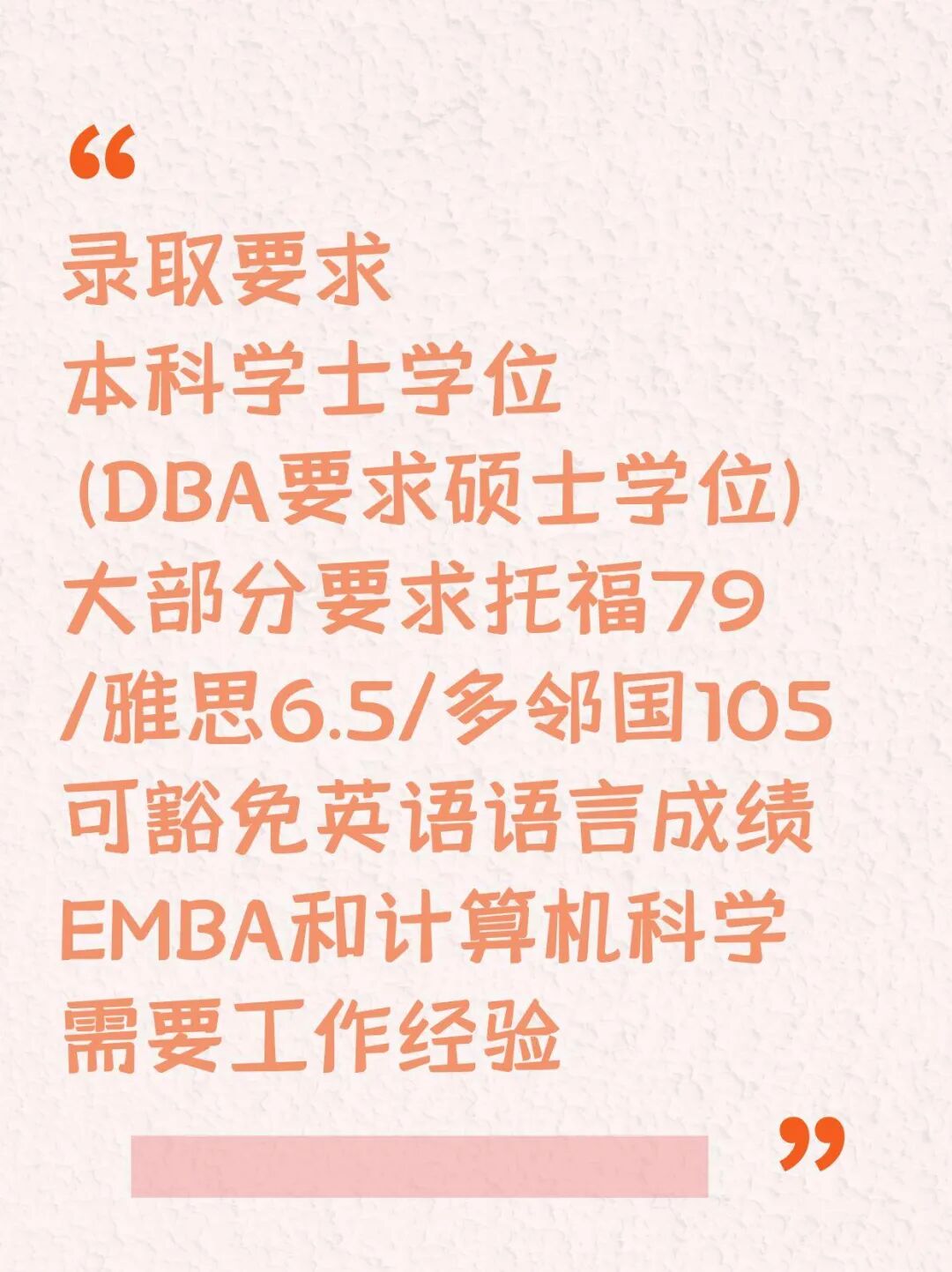 录取要求:(1)本科学士学位。DBA要求硕士学位。(2)英语标准化考试成绩要求:托福79分,或雅思6.5分,或多邻国105分。护理硕士要求托福79分(口语26分),或雅思6.5分(单项5.5分,口语7分),或多邻国105分(单项95分)。如在美国学习或工作过,则无需提交英语标准化成绩。(3)背景要求:EMBA需要学士学位加5-7年专业工作经验,或硕士学位加3-5年专业工作经验。计算机科学硕士需要有计算机、软件工程等相关领域学士学位加1年专业工作经验,或非相关领域学士学位加5年IT专业工作经验。
