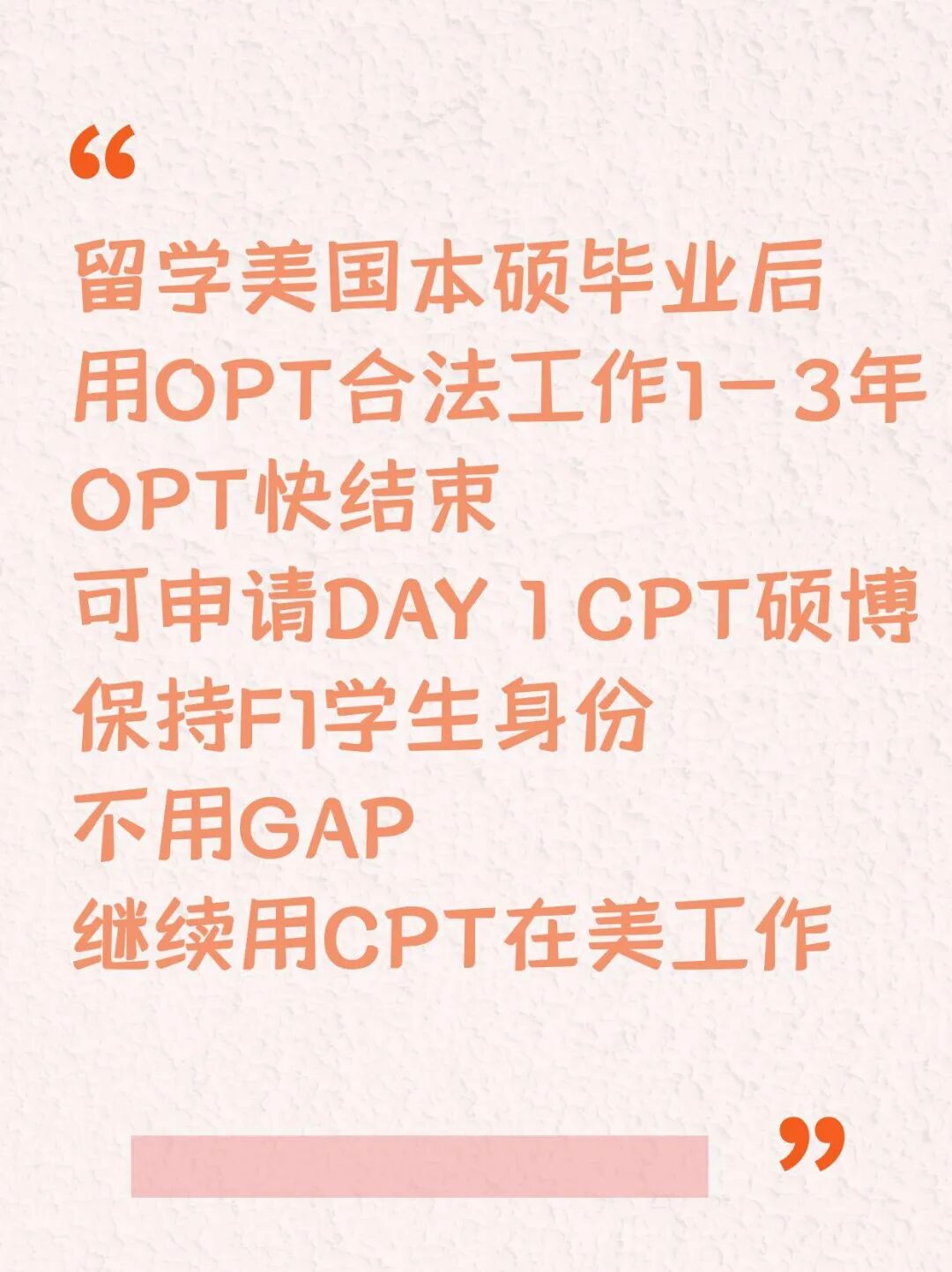 持美国F1学生签证,留学美国本科硕士,毕业后可以使用OPT在美国合法带薪工作1-3年。OPT快结束,想继续在美国工作怎么办?可以申请下一个DAY 1 CPT硕博研究生课程,保持F1学生身份,不用GAP,继续使用CPT在美国工作。