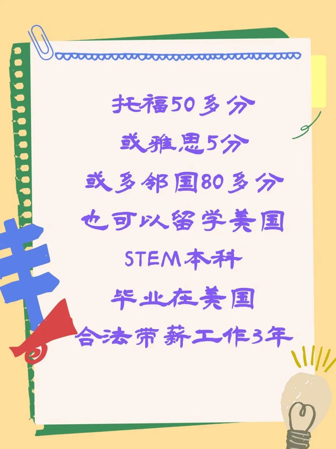 托福50多分,或雅思5分,或多邻国80多分,也可以留学美国STEM本科,毕业在美国工作3年。乔治梅森大学和俄亥俄大学开设多个本科热门STEM课程,如果学生成绩没有达到本科直录要求,可以申请双录取或国际大一,达到要求后进入本科正科,毕业后使用OPT在美国合法带薪实习。