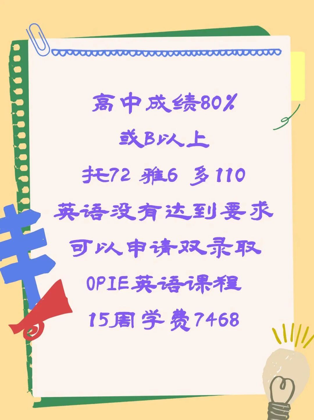 录取要求:高中成绩80%或B以上。英语标准化考试成绩要求:托福72分(写作17分),或雅思6分(单项5.5分),或多邻国110分。如果学生英语语言成绩没有达到要求,可以申请本科双录取,学习OPIE英语课程,15周为一个学期,学费为7468美元。学生托福纸考成绩达到520分(商科学生达到525分),且写作成绩达到5分,就可以进入本科正课学习。