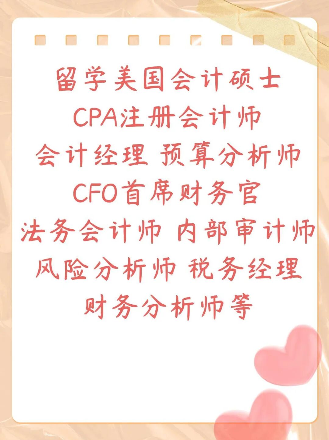 留学美国会计硕士,除了考取美国CPA注册会计师之外,还可以从事会计经理、预算分析师、首席财务官(CFO)、法务会计师、内部审计师、风险分析师、税务经理、财务分析师等。学生持F1学生签证,完成9个月到1年的硕士课程,拿到学位后,可以在美国合法带薪工作1-3年。