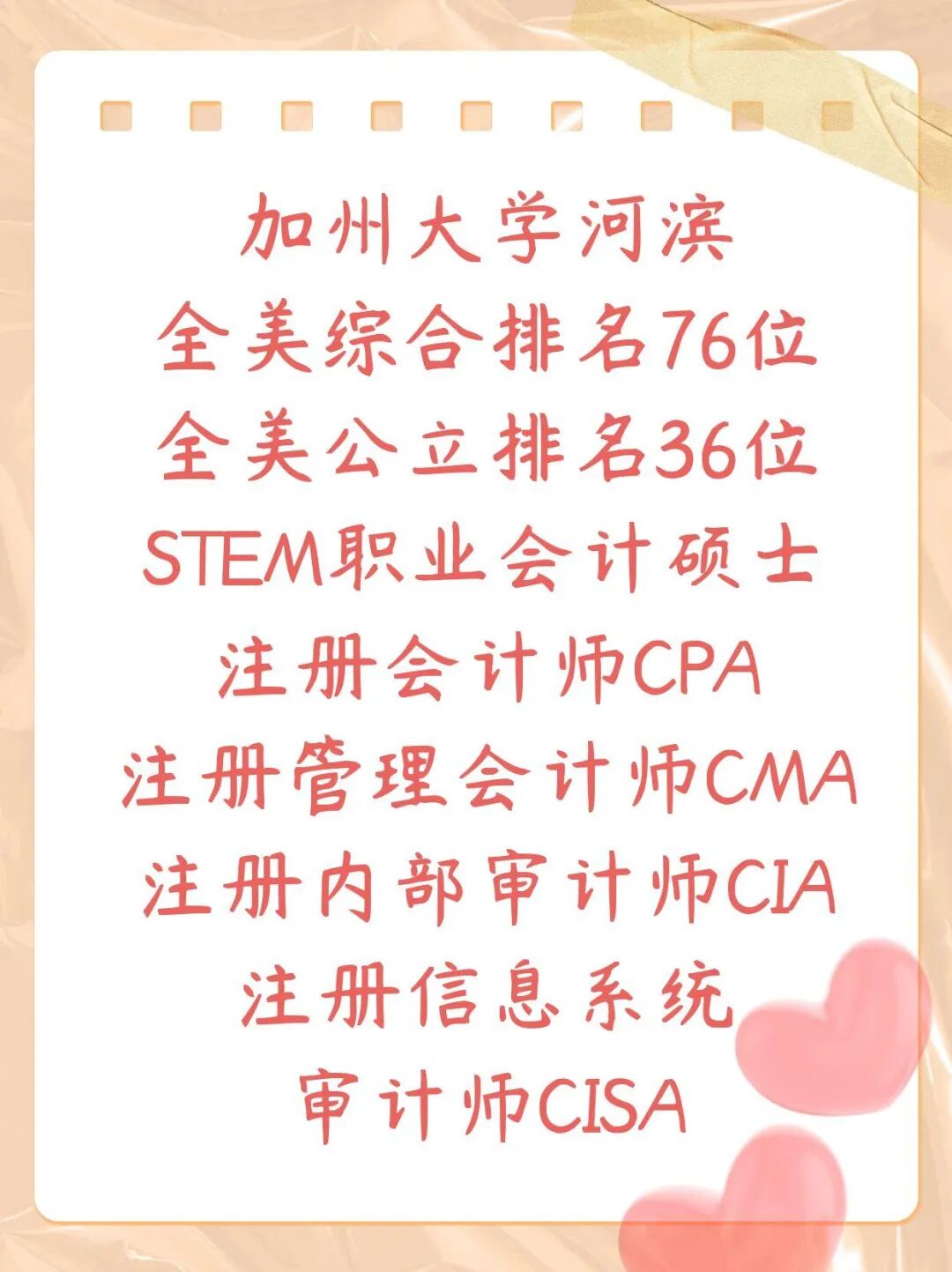 加州大学河滨开设STEM职业会计硕士,提供通过美国注册会计师CPA、注册管理会计师CMA、注册内部审计师CIA、注册信息系统审计师CISA考试的能力培训。共48个学分,最快9个月完成,学费共约6.6万美元。毕业生去向包括毕马威、安永、德勤、普华永道等。