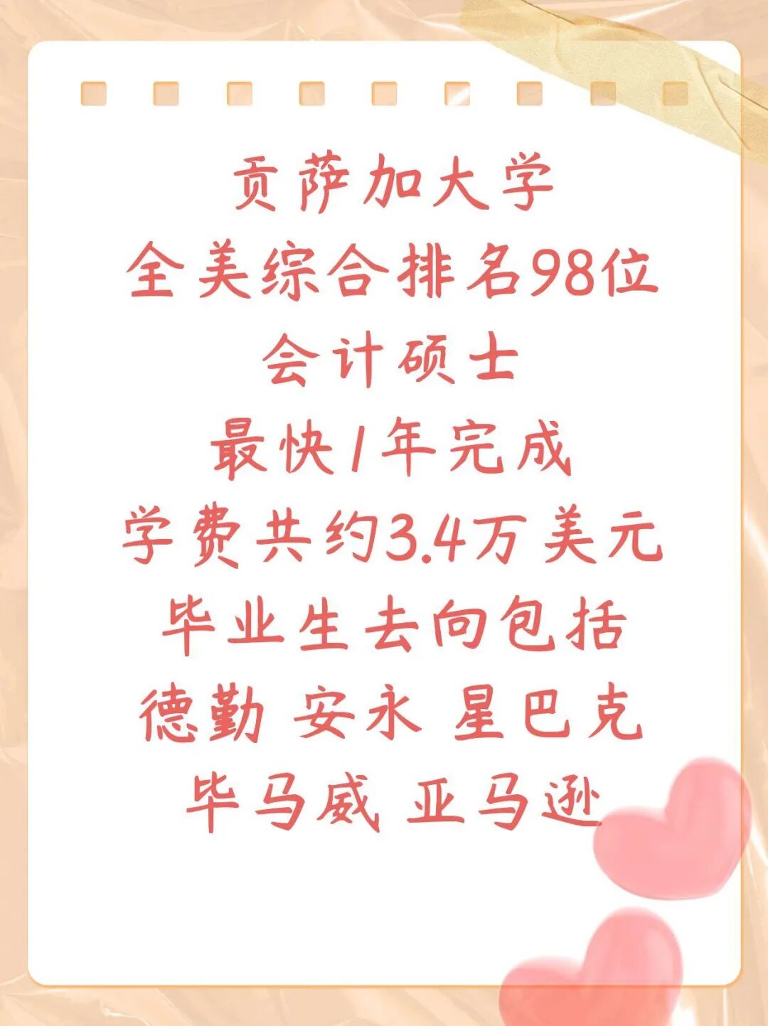工商管理学院开设会计硕士,共30学分,最快1年完成,学费共约3.4万美元,可以按月支付。毕业生100%在毕业后3个月内找到工作,包括德勤、安永、星巴克、毕马威、亚马逊、RSM、普华永道、微软、耐克等世界知名企业。