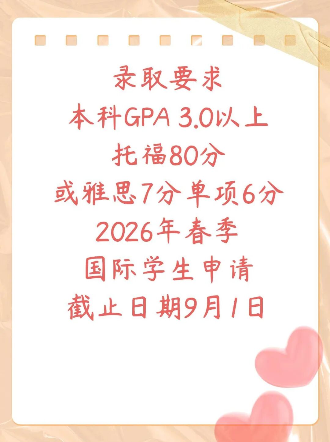 录取要求:本科GPA 3.0以上;英语标准化考试成绩要求:托福80分,或雅思7分(单项6分)。2026年春季国际学生申请截止日期为9月1日。