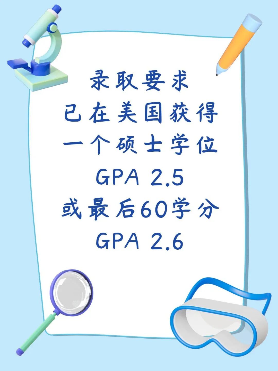 录取要求:已在美国获得一个硕士学位,GPA 2.5或最后60学分GPA 2.6。每年6次滚动开课,建议提前2个月申请。